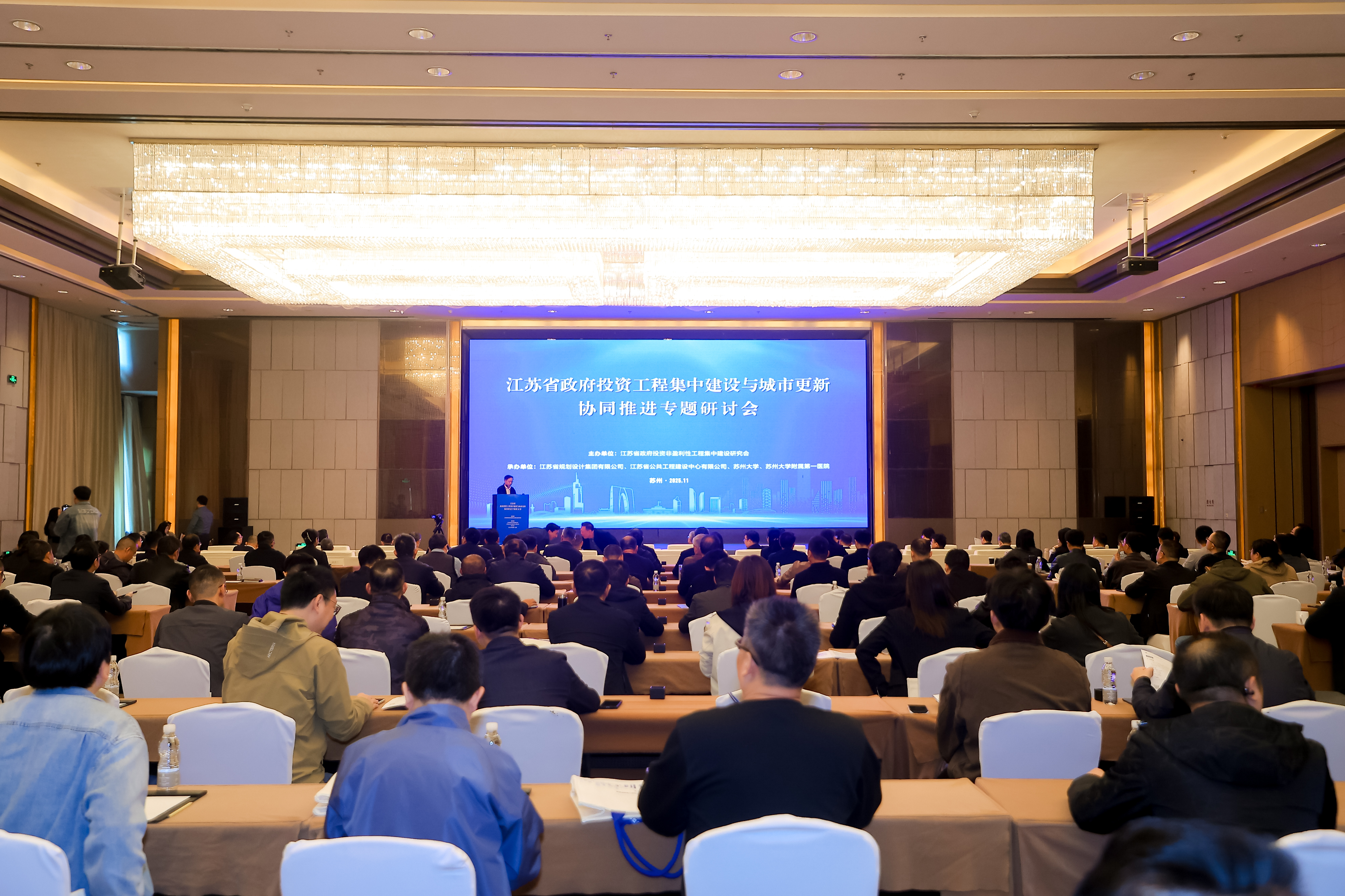 11月5日至6日,由江苏省政府投资非盈利性工程集中建设研究会主办,江苏省规划设计集团有限公司、江苏省公共工程建设中心有限公司、我校及附属第一医院承办的江苏省政府投资工程集中建设与城市更新协同推进专题研讨会在苏举行。省住建厅副厅长、省集中建设研究会会长张钧,我校党委常委、副校长王云杰,市住建局副局长陈建忠,省住建厅、省卫健委、省机关事务管理局、省疾控中心、省公建中心、市级住建局等部门的有关人员,省内高校、医院、设计院、企业代表等共200余人参加会议。开幕式由省住建厅二级巡视员、省集中建设研究会常务副会长兼秘书长曹良春主持。