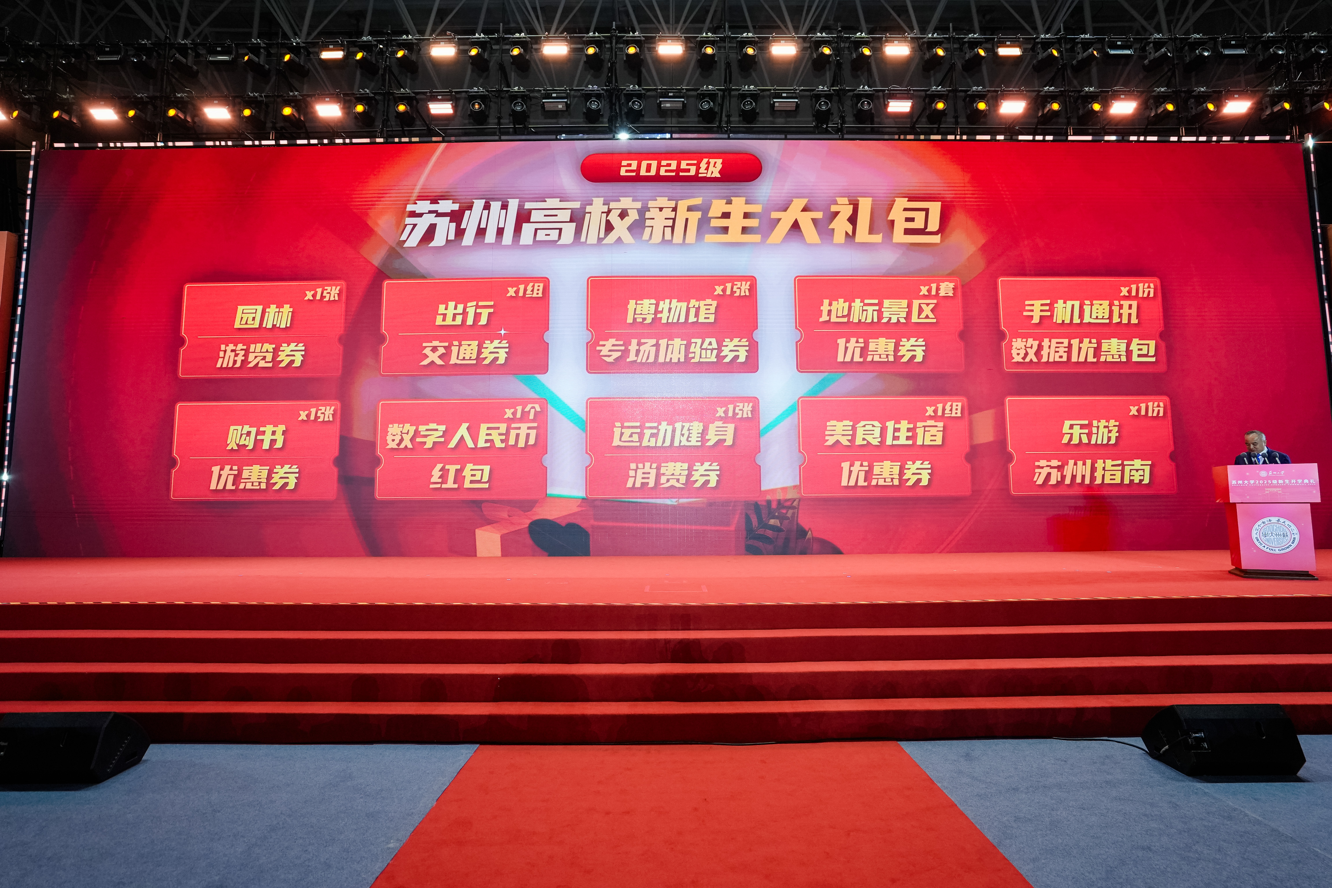名城育名校,名校润名城。为欢迎2025级新生来到苏州这片热土,苏州市委市政府特别准备了一份满载心意的“新生礼包”。金洁、张晓宏、张桥共同上台开启赠礼。