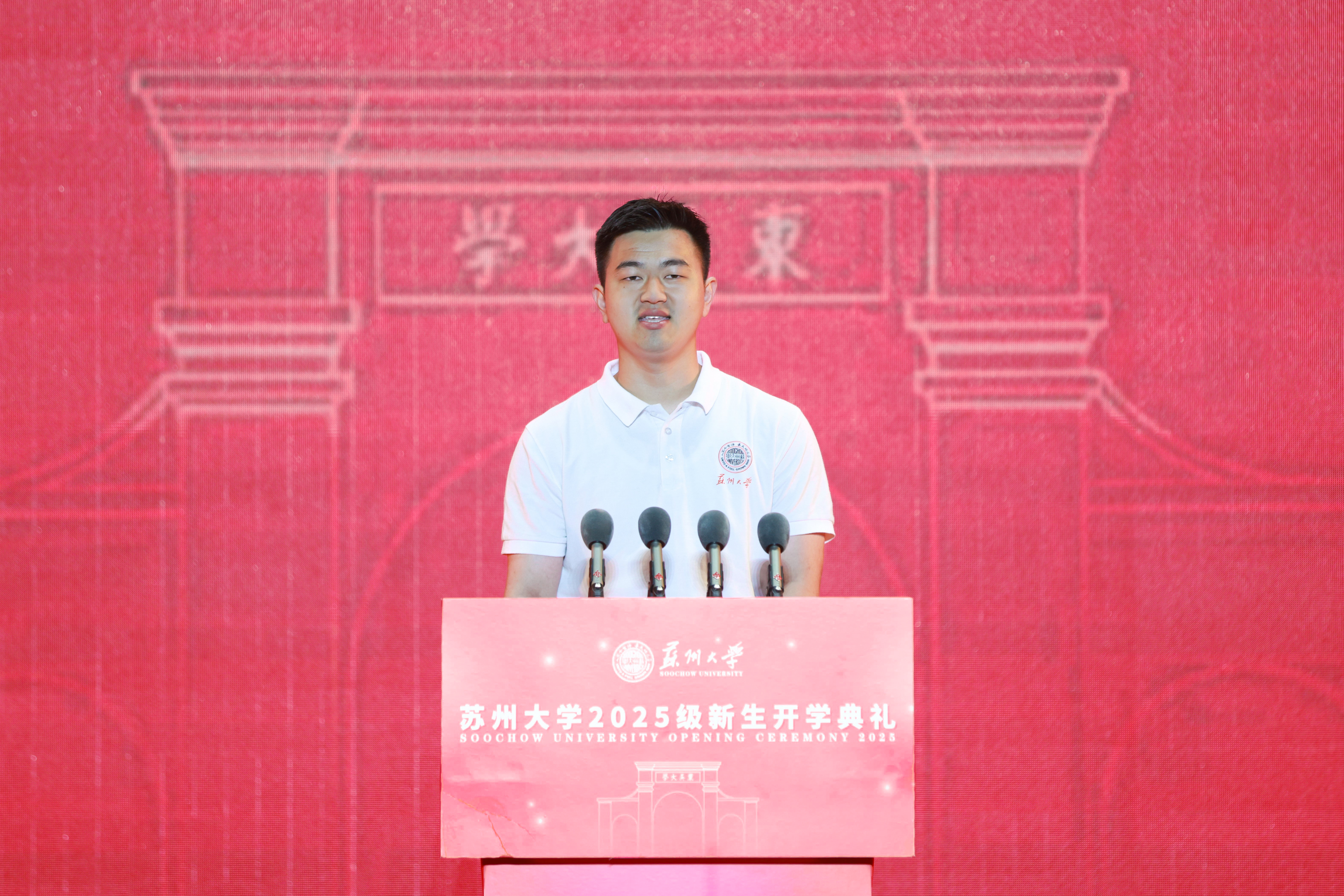 老生代表、2023级教育学院硕士研究生王曹仡超回顾了从课堂学习到西部实践的成长历程,分享了自己的奋斗故事。他鼓励新同学勇于尝试、扎实进取,在苏大找准方向、拔节生长,让青春之花在民族复兴的伟大征程中绽放。