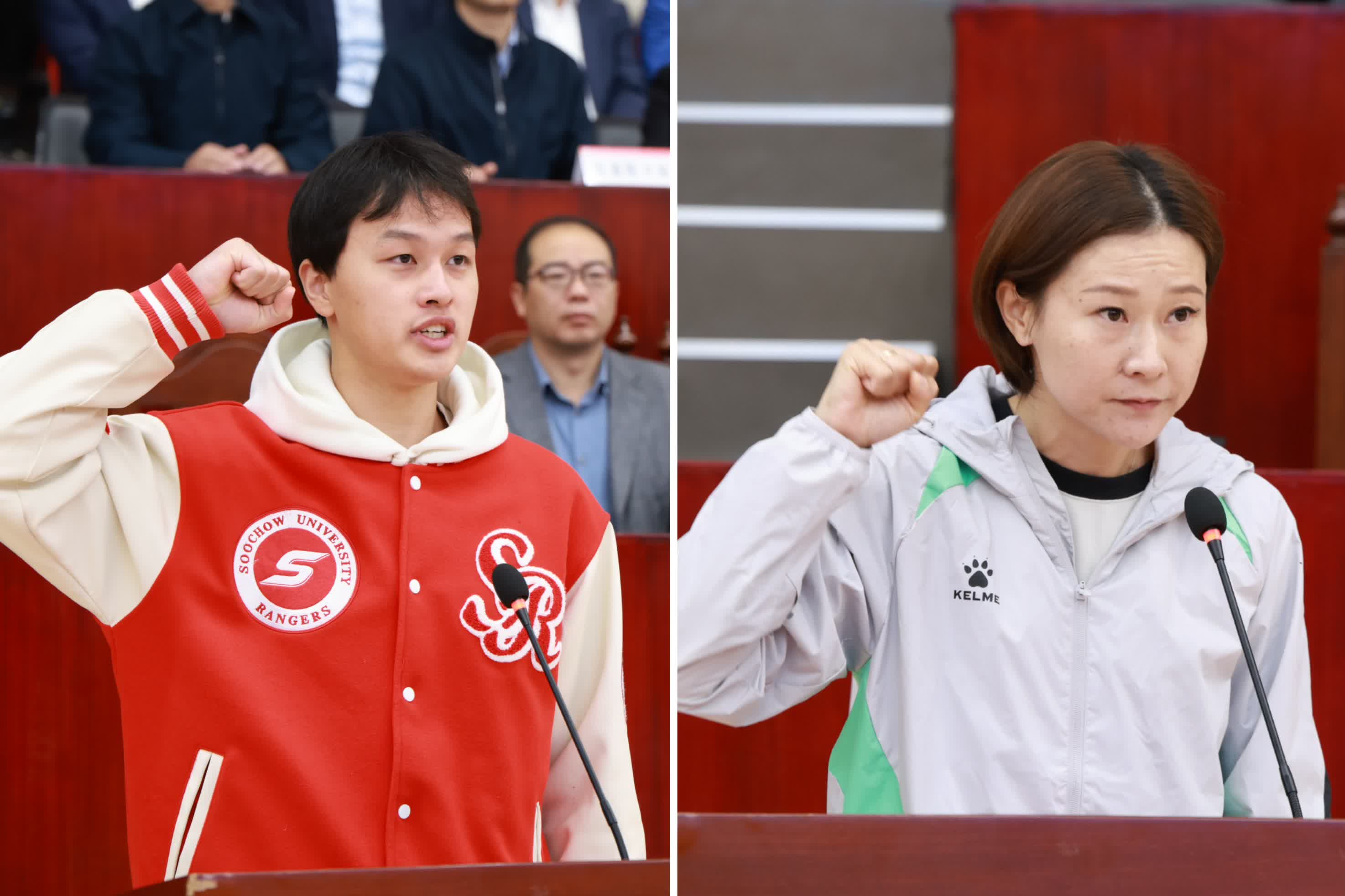 全国大学生橄榄球联赛三冠王、东吴游骑兵橄榄球队队长、苏州医学院陈雨琪代表运动员宣誓,将以积极饱满的态度投入比赛,全力以赴、赛出风格、赛出水平,坚持在竞赛中学习,在交流中成长。亚运会冠军、国际级运动健将、东吴学院蒋兰老师代表裁判员宣誓,将严格遵守竞赛规程及规则,恪守体育职业道德、履行裁判职责,秉持公平、公正、公开的原则,确保运动会各项赛事顺利举行。