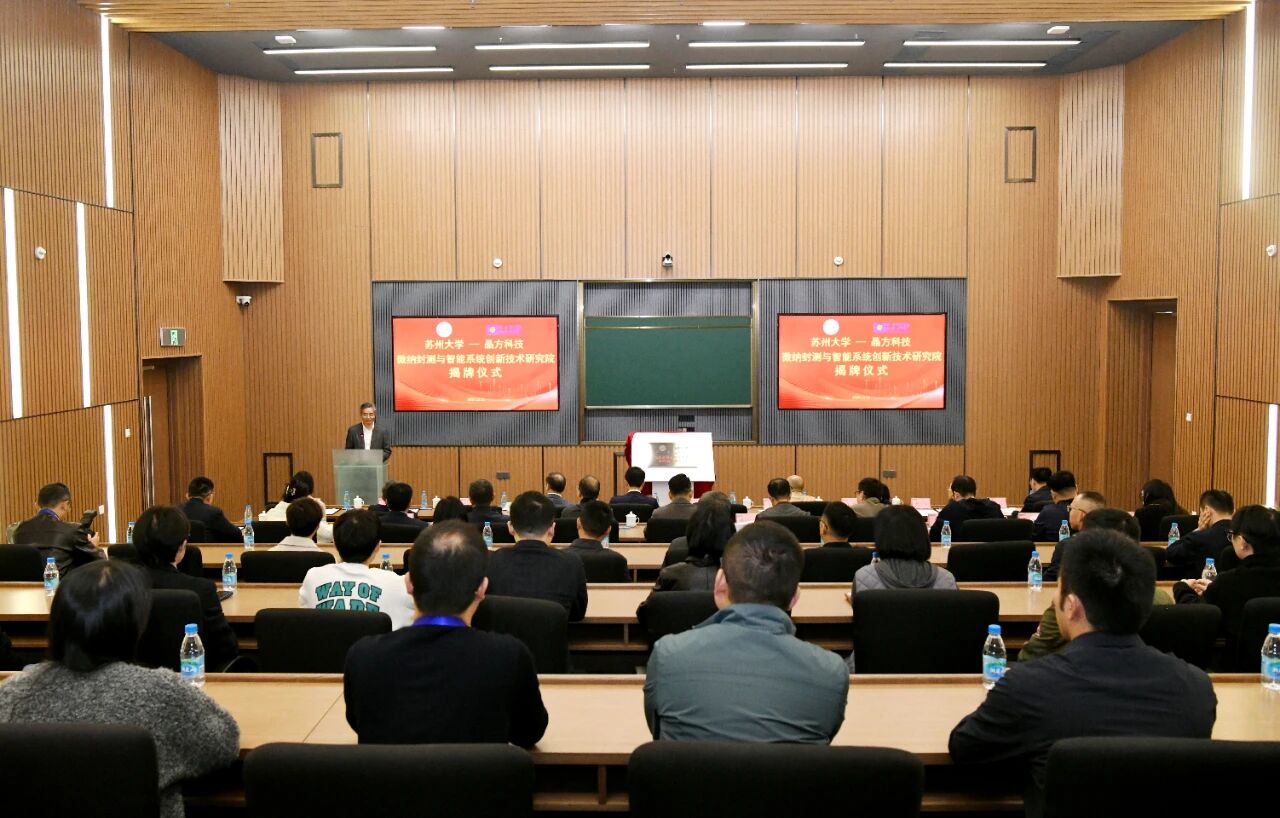11月11日,在苏州市政协的积极推动下,我?;绻こ萄г河胨罩菥Х桨氲继蹇萍脊煞萦邢薰竞献?,成立苏大晶方科技微纳封测与智能系统创新技术研究院,进一步深化名城名校融合发展,推动产业创新。苏州市政协主席朱民、秘书长吴炜,我校校长张桥,党委常委、副校长张正彪出席揭牌仪式。